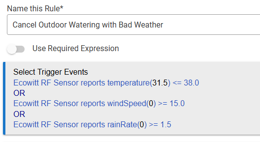 I received an Ecowitt weather station for Christmas. It is the WS90 with the indoor display. I have it connected to my HE hub and the hub is receiving updates. I also joined my Rachio to my HE hub and it found my zones so I know both are talking to HE. What I cannot find is help knowing how to set up rules that will stop watering if the temperature drops too low, the wind kicks up or it starts to rain. I only want the rule to stop that watering session so that future watering sessions remain scheduled. I'm using Rule Machine 5.1 for all of my rules so I am familiar with those. I just need some guidance for getting this set up.