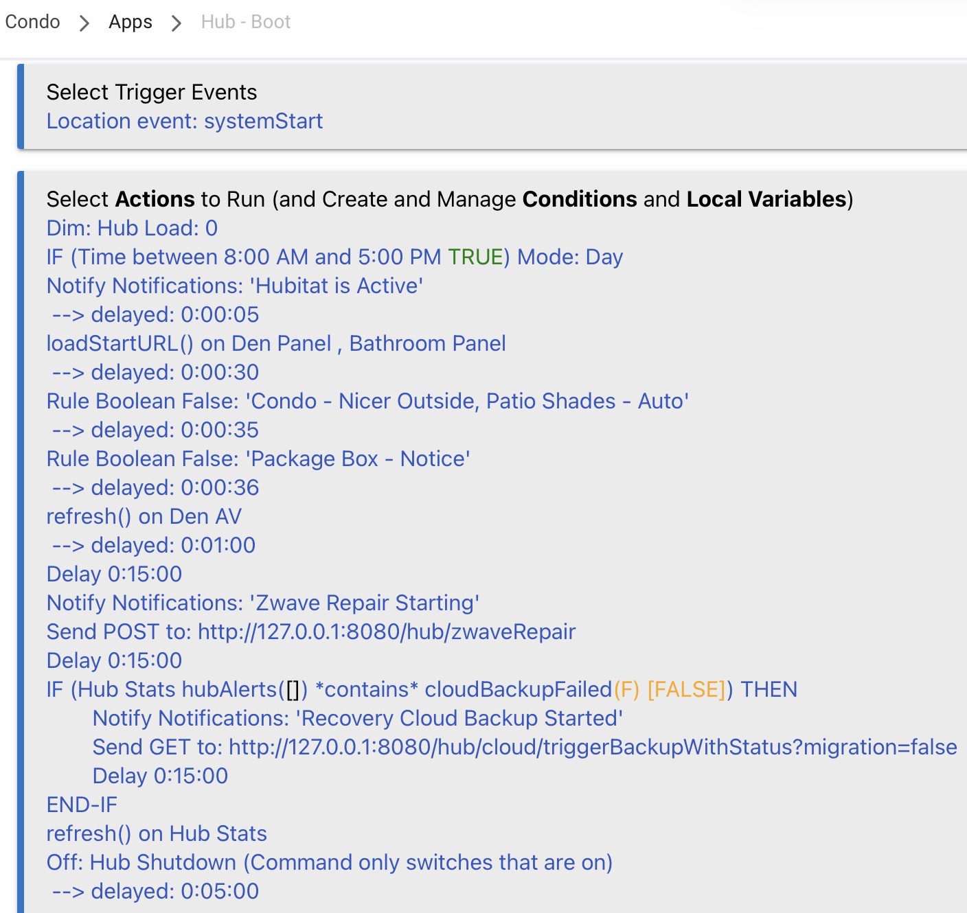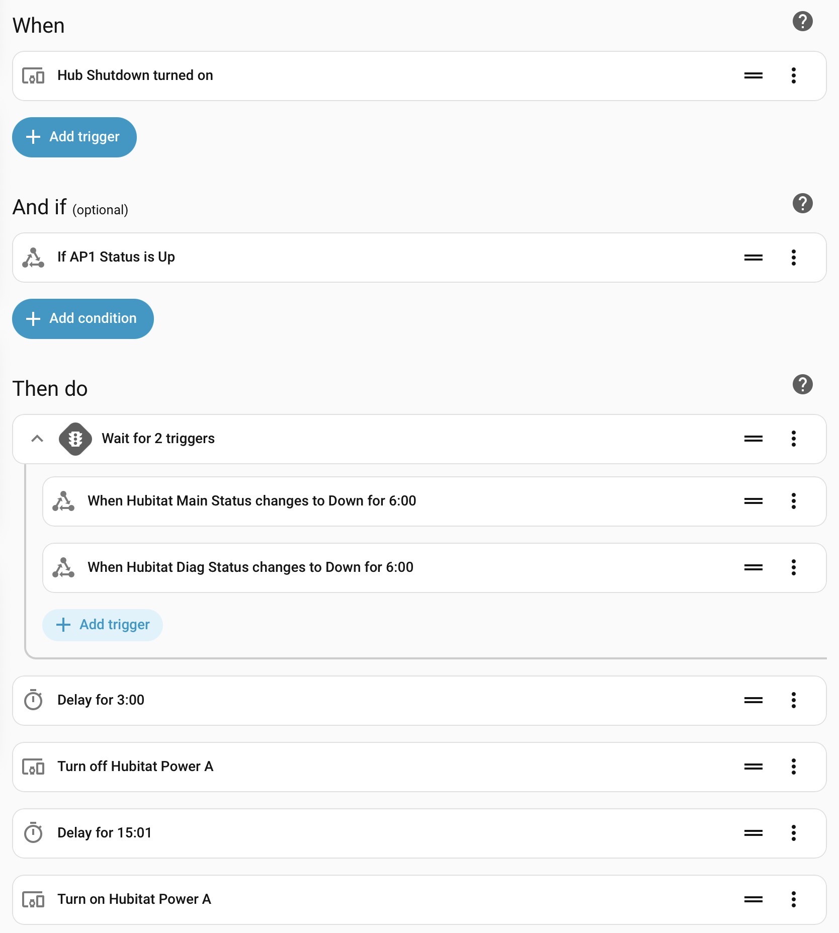But I do have a number of things in place that kick in only if I'm away. If my internet connectivity as viewed from the hub stays down more than 10 minutes, I begin rebooting routers and cable modem periodically until it comes back. On the other hand, if my internet connectivity is fine, but my hub becomes unresponsive from the outside, this is where I power cycle the hub forcefully (using an out-of-band smart plug) as a last resort.