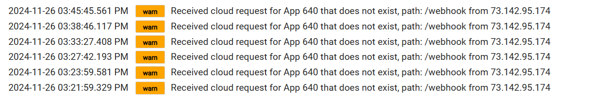 Warnings like the one in your screenshot generally come from an outside service that you configured to interact with Hubitat at some point, but then deleted on Hubitat’s end. So now the hub doesn’t know what to do with an attempted connection that’s still coming in from the outside.