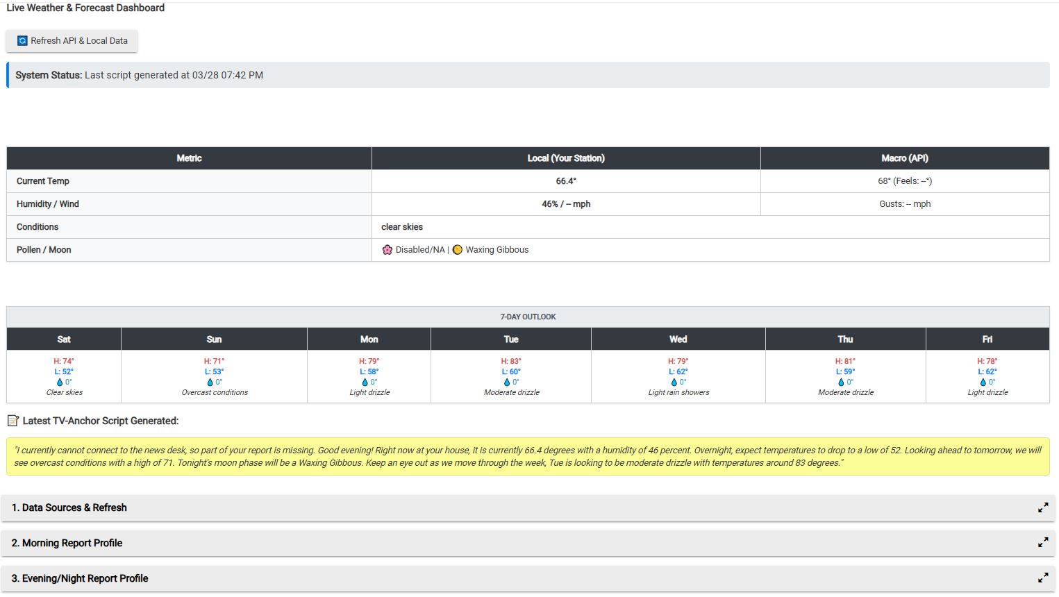 - TV-Anchor Style Script Generation: The app dynamically writes a conversational weather script that can be broadcasted via TTS speakers or sent to notification devices. You can view the latest generated script directly in the app's dashboard.