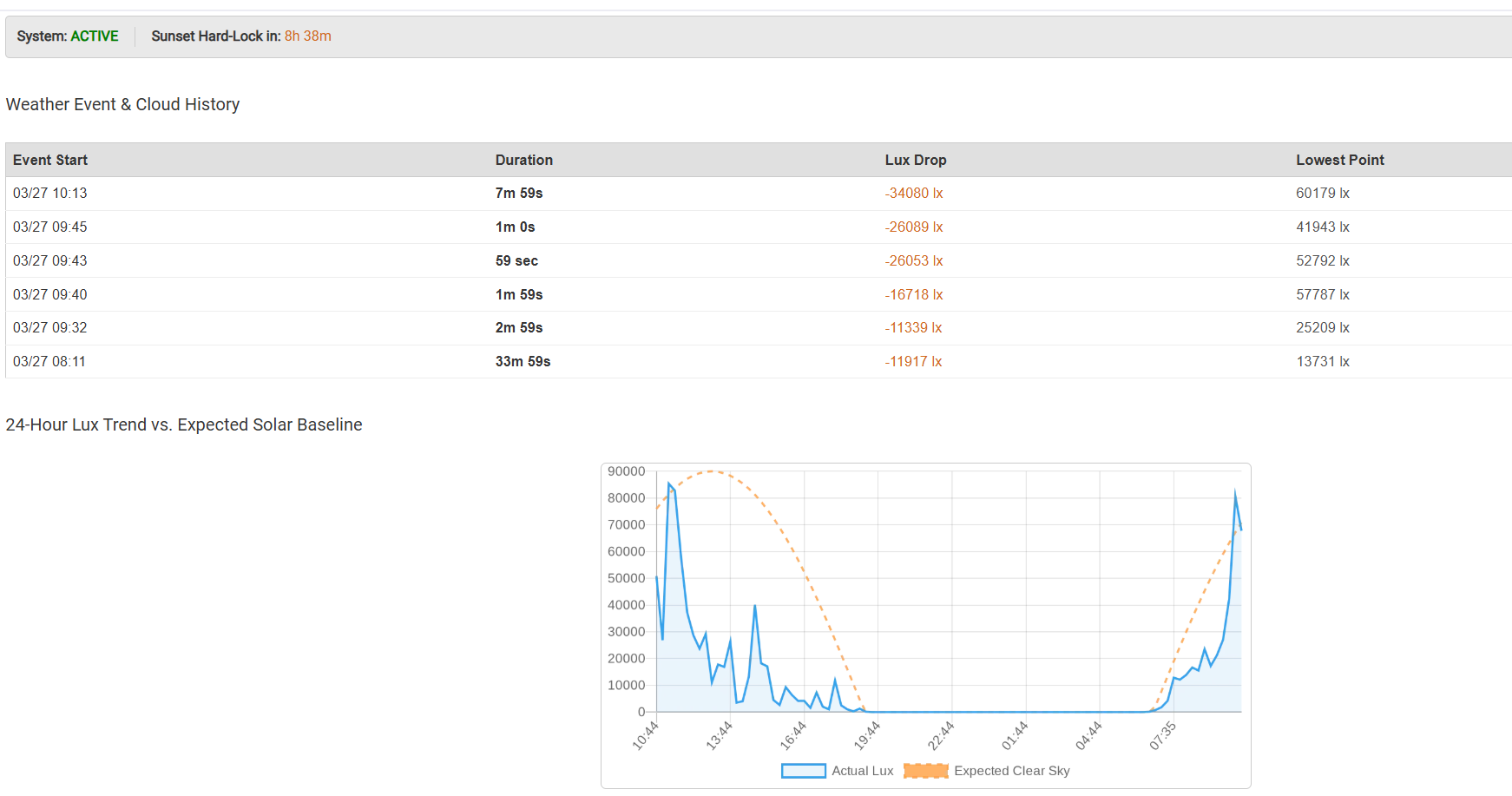 All-New "Peak Tracker" for Weather Events: The old logic calculated sudden lux drops by comparing the current reading to the immediate previous reading. The flaw? A massive storm doesn't drop from 85k to 30k in a single millisecond; it sends multiple updates on the way down. Because the baseline reset on every ping, the app was blind to the massive overall drop. The app now utilizes a Peak Tracker that holds the highest recent lux value and measures the total drop over a rolling time window. (You'll also notice the logging terminology has been updated to track these as "Potential Clouding" events).