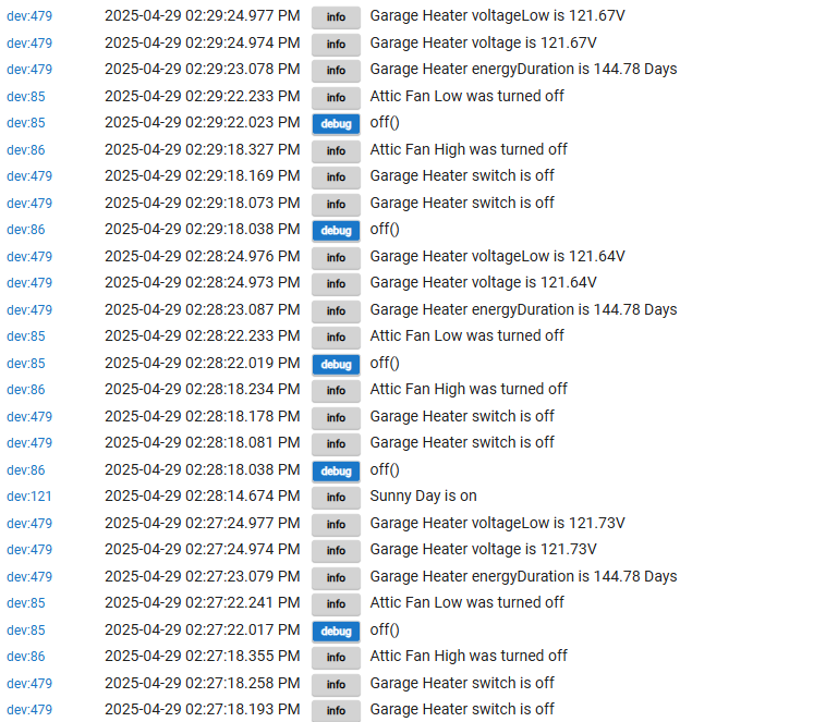 Here is current log - all three of these are V Thermostats. Every minute it fires off an off or on event depending on state. These thermostats are all set to off at present and still do this.
