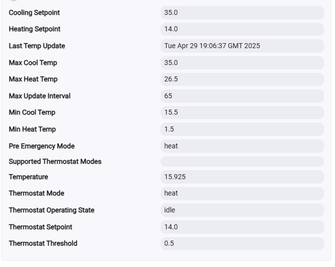 so its a problem for years just never been brave enough to remove the whole thermostat and re-add at winter time. now I have 2 weeks just myself so can improve stuff. Also planning to add one more sensor to the furthest point of the apartment as the aeotec multisensor seems not so reliable. Actually this code I think does not need any more overcomplication. its just works as is. no fancy stuff, clear code, easy to read, it can't luch rockets, just set the temperature and it works perfect in the last 2 winters for me. One thing I found problematic but that's a pebkac and not a code issue. if you change the temperature too quickly up and down it goes to emergency off. but its understandable thats the whole point of emergency off, to stop idiots. I had problems with the mentioned aeotec multisensor too, if it renders the thermostat to emergency off, no way to restore it. I've set the aeotec's driver to standard z-wave temperature sensor and that's it.
