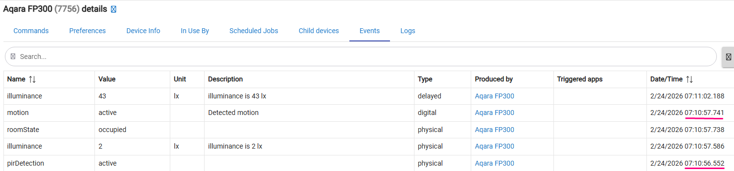 So, during some testing today I believe I may have found the same issue you mentioned above, but I am not 100% certain. From my quick testing, it appears that the pirDetection sensor is not being used by the driver to trigger the standard “motion” attribute. Only the roomState (mmWave) sensor seems to be controlling the Hubitat standard “motion” attribute. Again, this is my hypothesis, as I do not know if the FP300 is sending three unique events (PIR motion, mmWave Occupancy, and combined “Motion”) OR just two unique events (PIR Motion and mmWave Occupancy.) If the latter, then the driver would have to perform the proper logic to combine PIR and mmWave to properly report Hubitat’s “motion” capability.