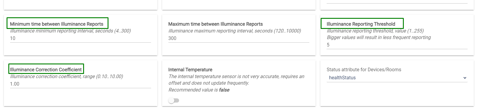- added configuration preference for the illuminance sensors - illuminanceMinReportingTime, illuminanceMaxReportingTime, illuminanceThreshold