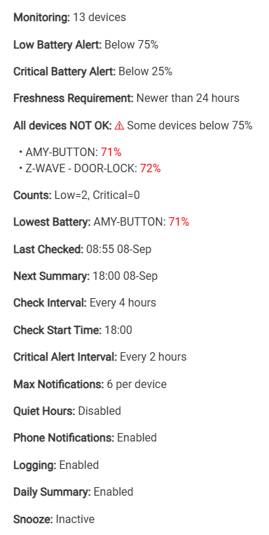 description: "Notify every X hours if battery is low, with summary, critical alerts, quiet hours, snooze, styled status, and consistent logging",