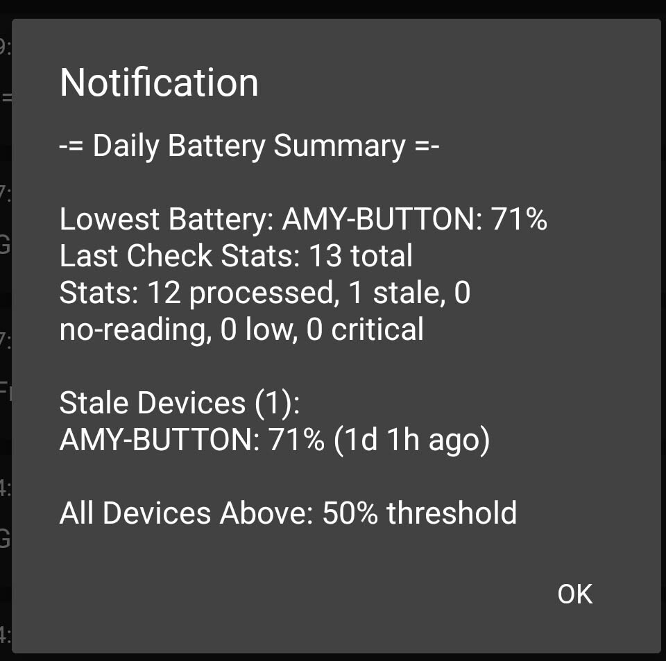 • Displays a styled status panel with low/critical counts, lowest battery, and last checked time.