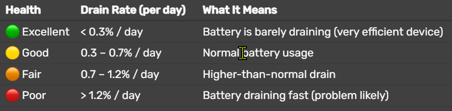 0.3 – 0.7% / day Normal battery usage Fair