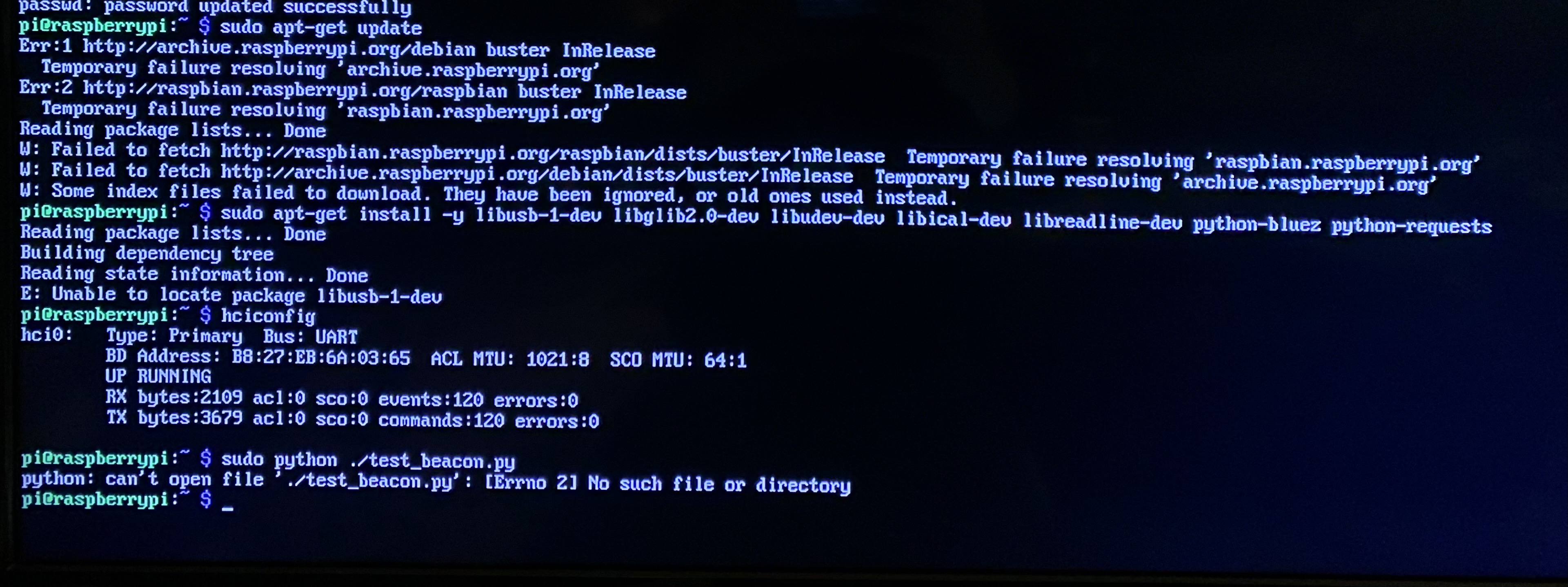 Not sure where to go from here. The libusb-dev file apparently was or is not on my Pi and obviously the ./test_beacon.py line did not work. I can access my Pi directly with keyboard and TV. I was not able to PuTTY in to the Pi. I spotted the Pi on my router but apparently it quickly fell off or is reported to be offline. Maybe because it is inactive or something but there was something about failing to "fetch" and having issues resolving "raspian.raspberrypi.org".