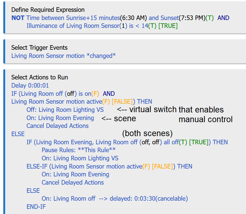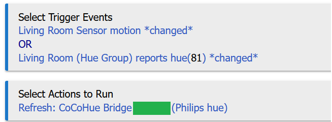 I want to have my "Living Room evening" scene turn on when my living room motion sensor is active, and turn off automatically after a certain time of inactivity. This is no problem. But what I also want to do is to be able to override this by the hue app or voice through siri to change the lighting in the living room. To stop the Living Room evening scene coming back on when the motion sensor is active, I have motion activity trigger the motion sensor to refresh the bridge, and if the lighting scene is not "Living Room evening" or "Living Room off" (when all lights are off), it should pause the rule and allowing manual control of the lighting. The problem I'm having is that the states of the scenes/bulbs don't seem to respond to refreshing the CoCo Hue Bridge so the rule isn't pausing properly until the next polling. I've created a Living Room virtual switch (VS) so I can also pause/unpause the rule using a remote switch which works well, but would like to replicate this without the switch too. Some screenshots of some of the rules below. Is there something I'm missing with the integration?