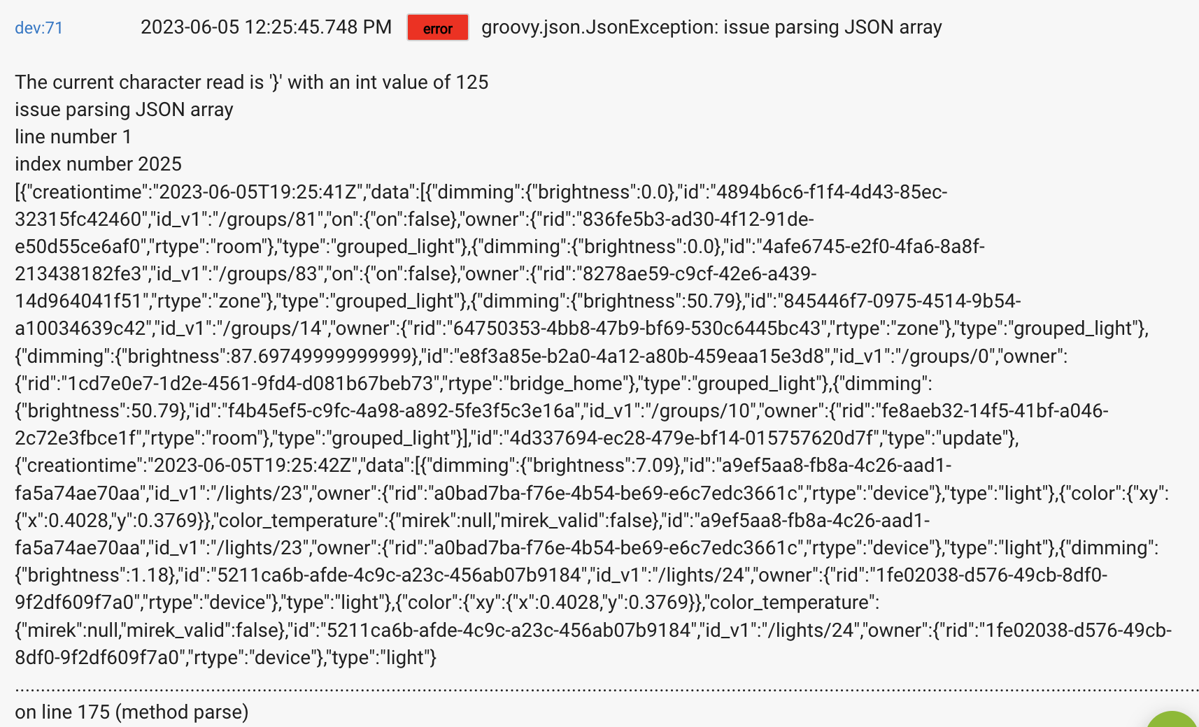 Can someone help me understand the error I'm seeing in the log for the CoCoHue Bridge device (not the log for the CoCoHue - Hue Bridge Integration). I'm assuming it has something to do with my use of one of the many scenes defined in the Hue bridge. I see this once or twice a day, but have not been able to correlate it with a specific event...