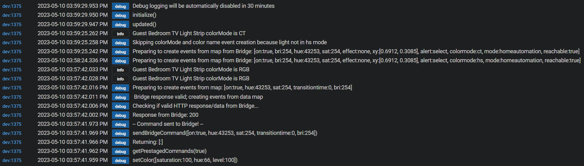 Hey Robert, I have a weird one. Upfront, this is not an app problem (pretty sure at least). I have two of these Gledopto controllers paired to the Hue hub. I've tried setting the controller to "RGB" and "RGBW" mode with the same behavior. They get into this state where I can't control the color anymore. The integration shows me command them to RGB color mode and the right color, but nothing changes on the light and a few seconds later, I see an event come in that sets them to "CT" mode in Hubitat.