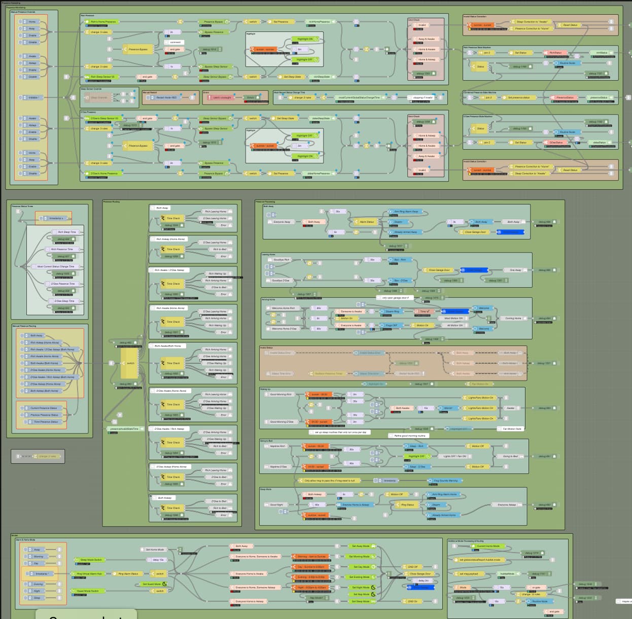 For a little background on my use, I'm using Node-Red to process all of my presence flows. The flows are very complex (see attached pic for an example of just my first tab of flows). Within the Hubitat app I'm using four different advanced combiners. Two of them track home/away presence for me and my wife using wifi presence, a virtual switch based on location reporting from the apple home app, and the hubitat mobile app. The other two track sleep/awake presence using Withings sleep sensors and the Sleep Number presence sensors (both of which have their issues, but work very reliably with advanced combiner).