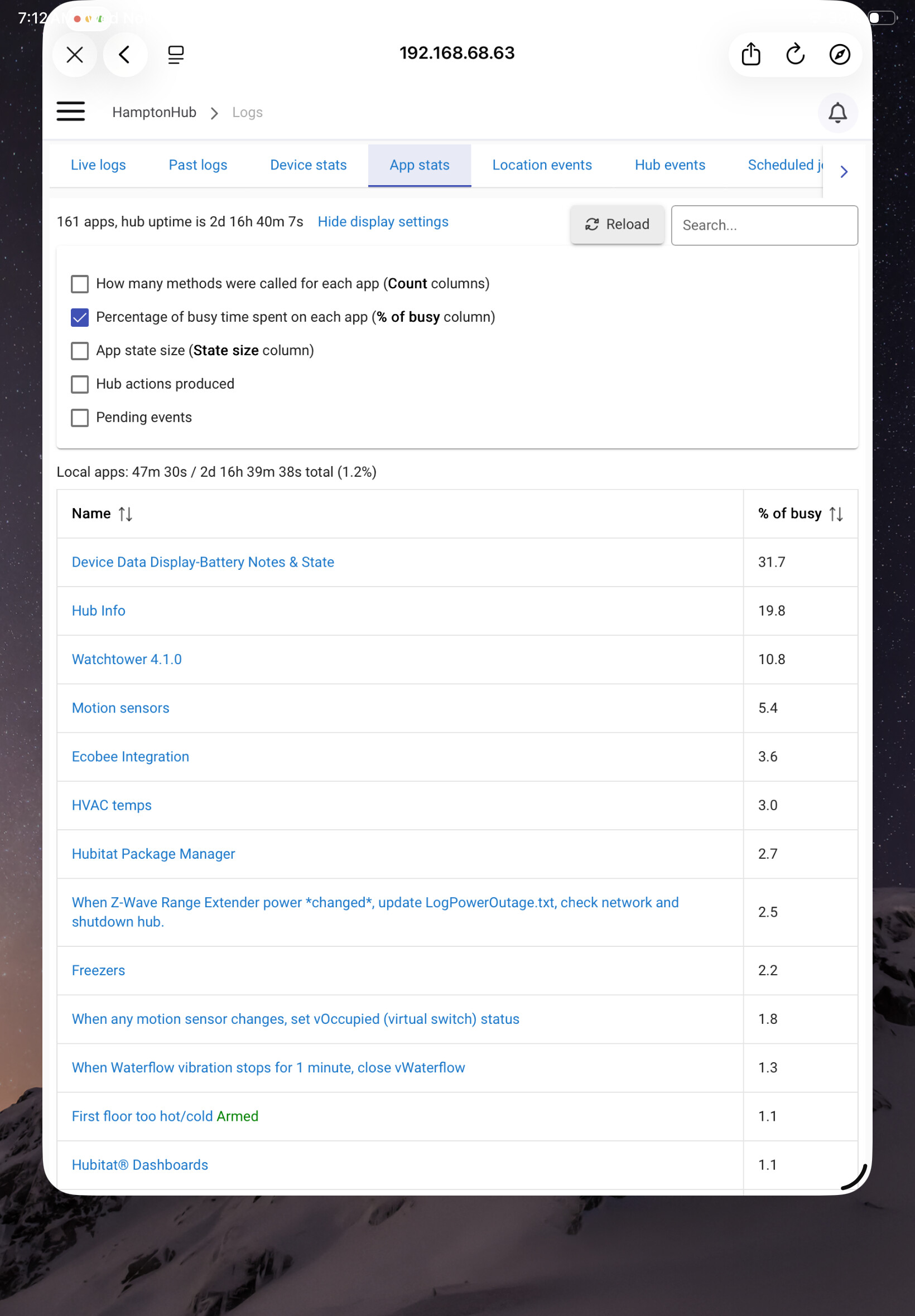 @thebearmay Your Device Item Data Display app is consistently at the top of my C7 hub’s App Stats (% of busy time). See screen shot. Most of my other apps are well below 10%. I use your app infrequently (once every month or so) to show me a report of custom device notes like BatteryType, BatteryDate and battery level for all my battery powered devices.