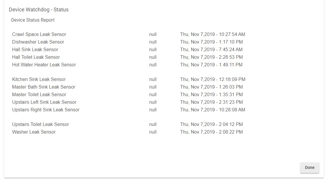 I just setup a Device Watchdog Status Child and this is the report result, I am assuming "null" means the leak sensors don't report back correctly?