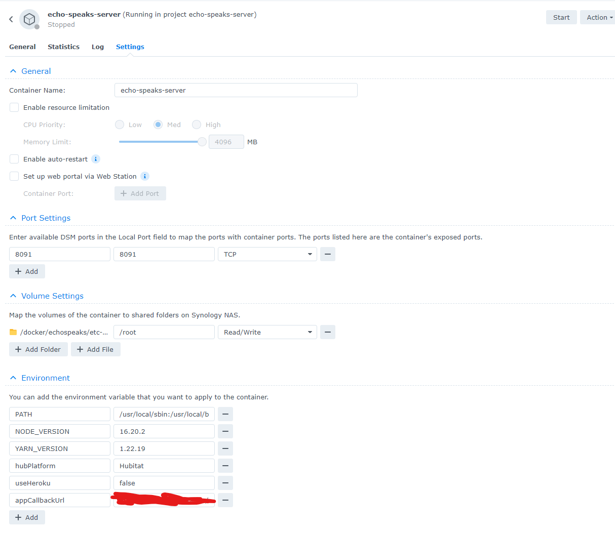 Create a project in Container Manager and use the following YAML code. If you choose to, enter your call back URL and remove the #. Also, you must pay attention to the volumes setting. This refers to where ES will be installed. Normally Synology places docker containers in a docker folder with each container in its own subfolder. This location gets mapped to the root folder/location in the docker container. In the commented example below you can see - /volume1/docker/echospeaks/etc-root:/root. The part before the : is the path on the Synology NAS. You can leave the /root after the :. There should be no need to setup a web portal.