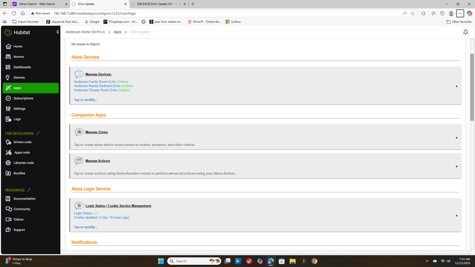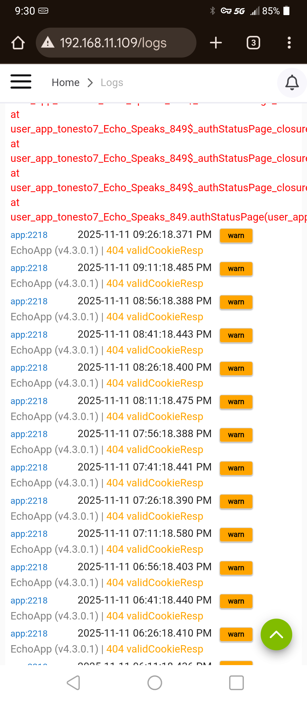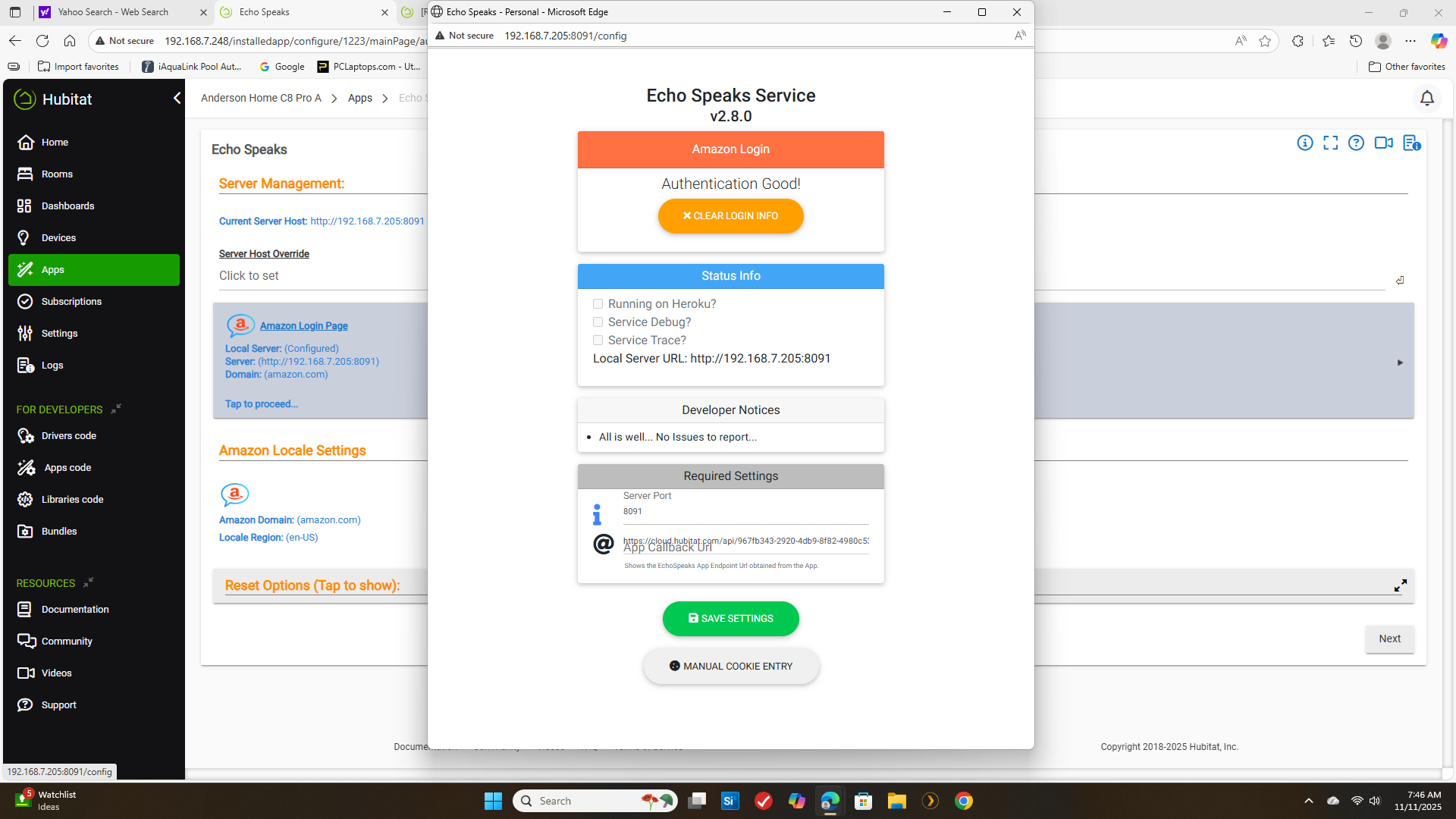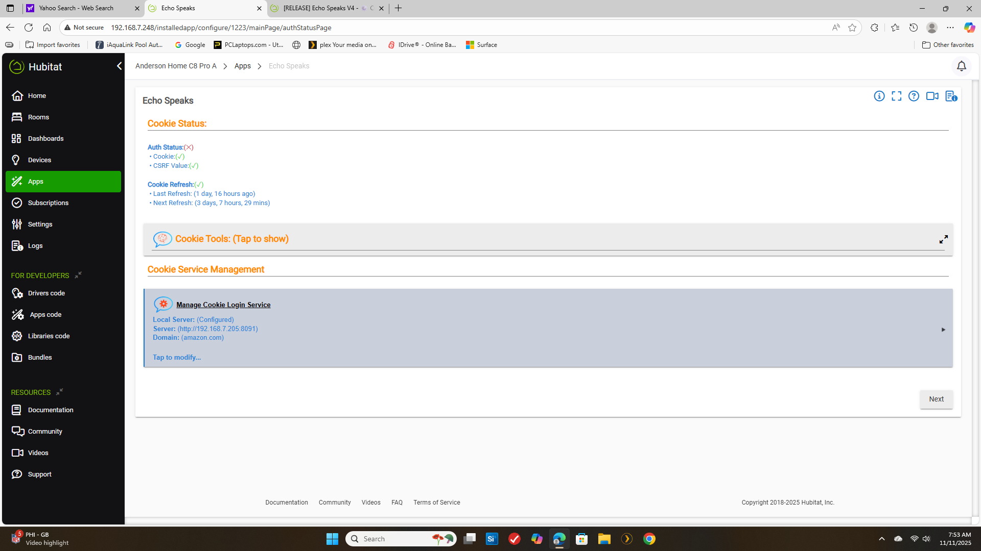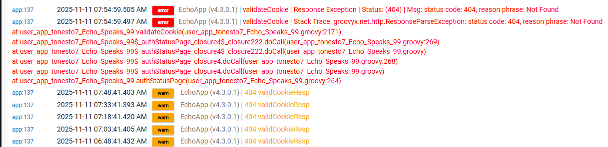 weird it stays in the server logs it got the cookie but cannot validate it.. 404 error .. not sure what it does to validate but it seems the url has changed.. wonder if it is the alexa plus crap?
