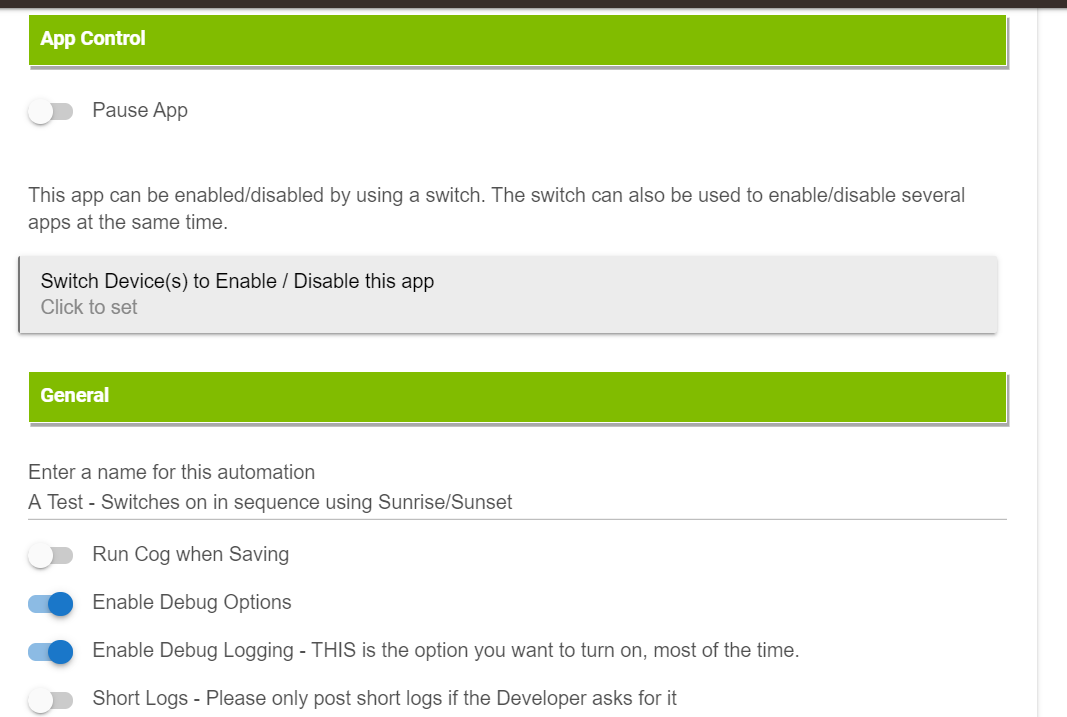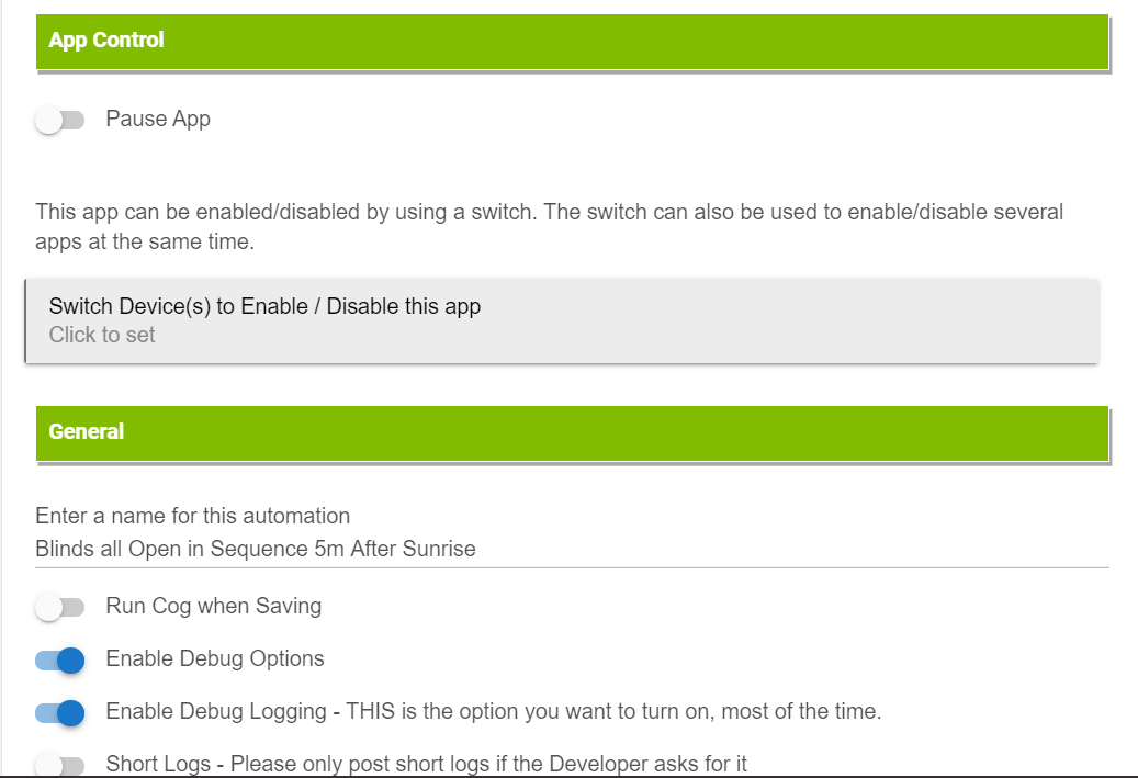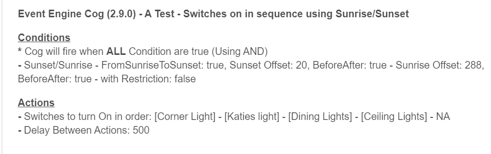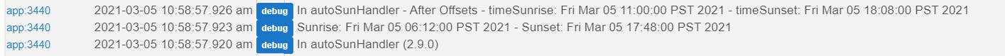 Thanks for the update...tried a simple test with Sunrise/Sunset to turn on some blinds and lights, (and then just lights in a second test) this AM, but it's not working for some reason, lights didn't come on, blinds didn't open. The "Just Sunrise" option also isn't working for me to turn on lights at x minutes after sunrise.