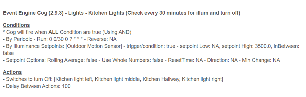 I have created a lighting Cog for my kitchen lights. I recently added a illuminance restriction on it, which works fine, but then it will run through the reverse condition and return the lights to a lower intensity.