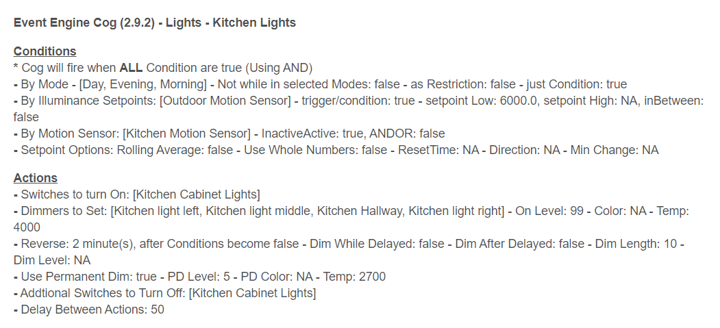 - True Reverse: true - Reverse: NA minute(s), after Conditions become false - Dim While Delayed: false - Dim After Delayed: false - Dim Length: NA - Dim Level: NA - Delay Between Actions: 100
