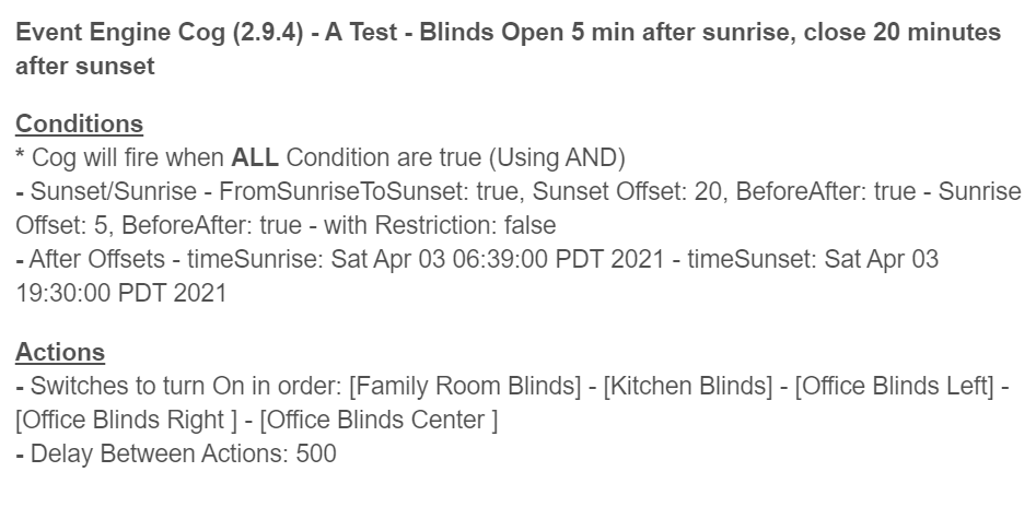 And interestingly, the cog just ran the sunset part and closed all my blinds at about 9:20 AM. So something about detecting sunset/sunrise appears to be off...