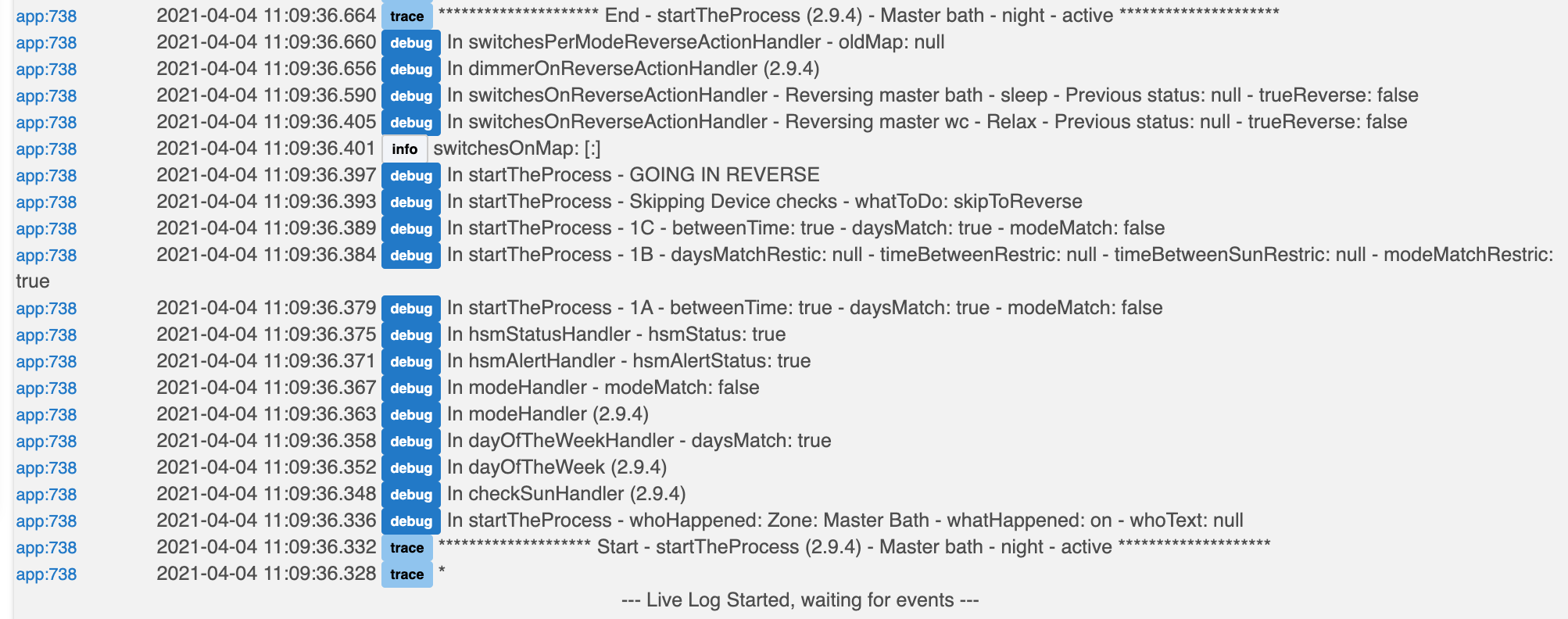 Result for my setup is the cog that matches the current mode turns my lights on and then this one that is setup for a different mode reverses and immediately turns the lights back off.