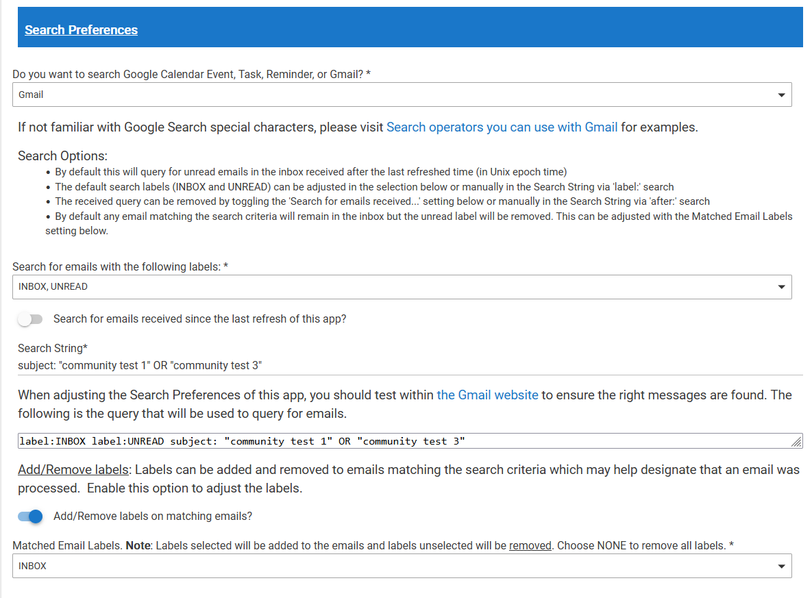 You are the first community member that has posted about using the Gmail search capability. Please let me know if there are things that could be added or improved for this functionality.