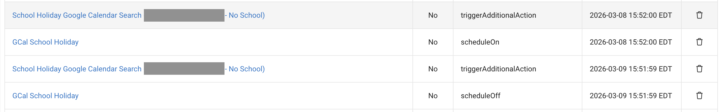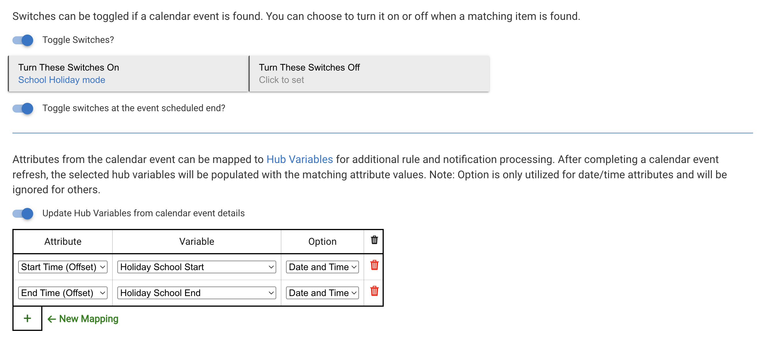 In this case, I have calendar entries that specify that there is a school holiday. It's an all day event and there is an offset of nearly -500 minutes. That way, at about 4pm the previous evening, School Holiday mode is supposed to turn on, and that switch affects things like bedtime, thermostat adjustments, wake up alarm, etc.