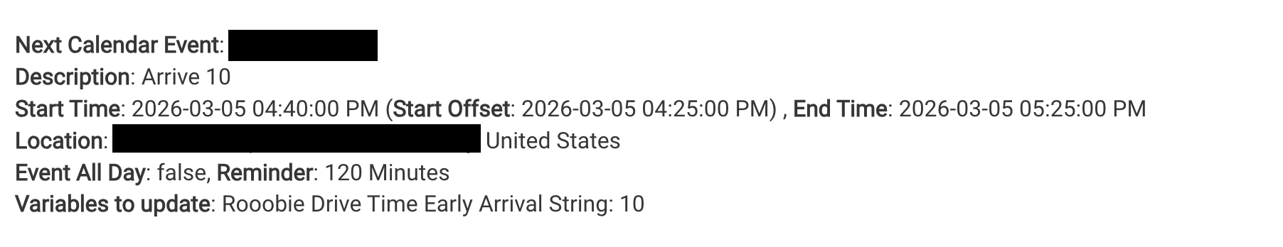 While we wait for @jtmpush18 and his log entries, I would like to say that I got the DriveTime device/driver working, created a Gcal search that only searches for a location that's NOT a video link, a couple hub variables, and two rules - one to submit the origin and destination to drivetime, collect info about the drive, and back calculate when the car should warm and a second rule to trigger at that calculated time and flip my existing car warming routine.