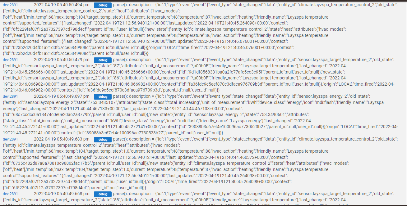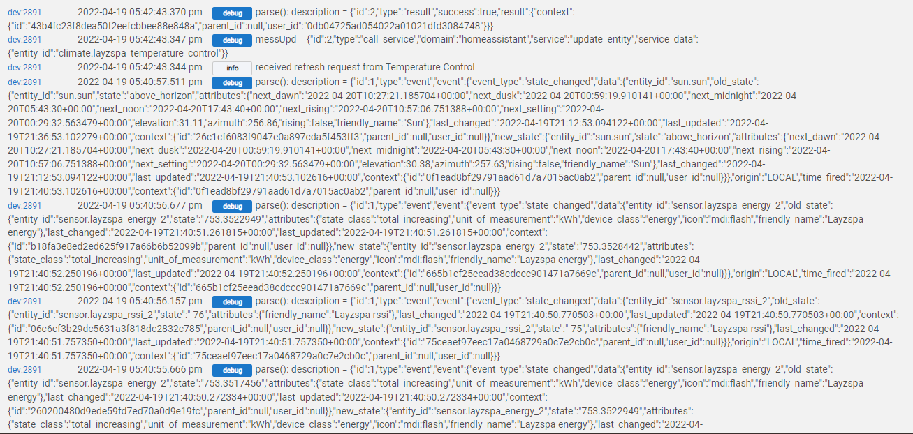 I only see energy and rssi in the logs you posted. Are you seeing temperature and switch state coming across? Is it configurable how often they report from the spa to MQTT?