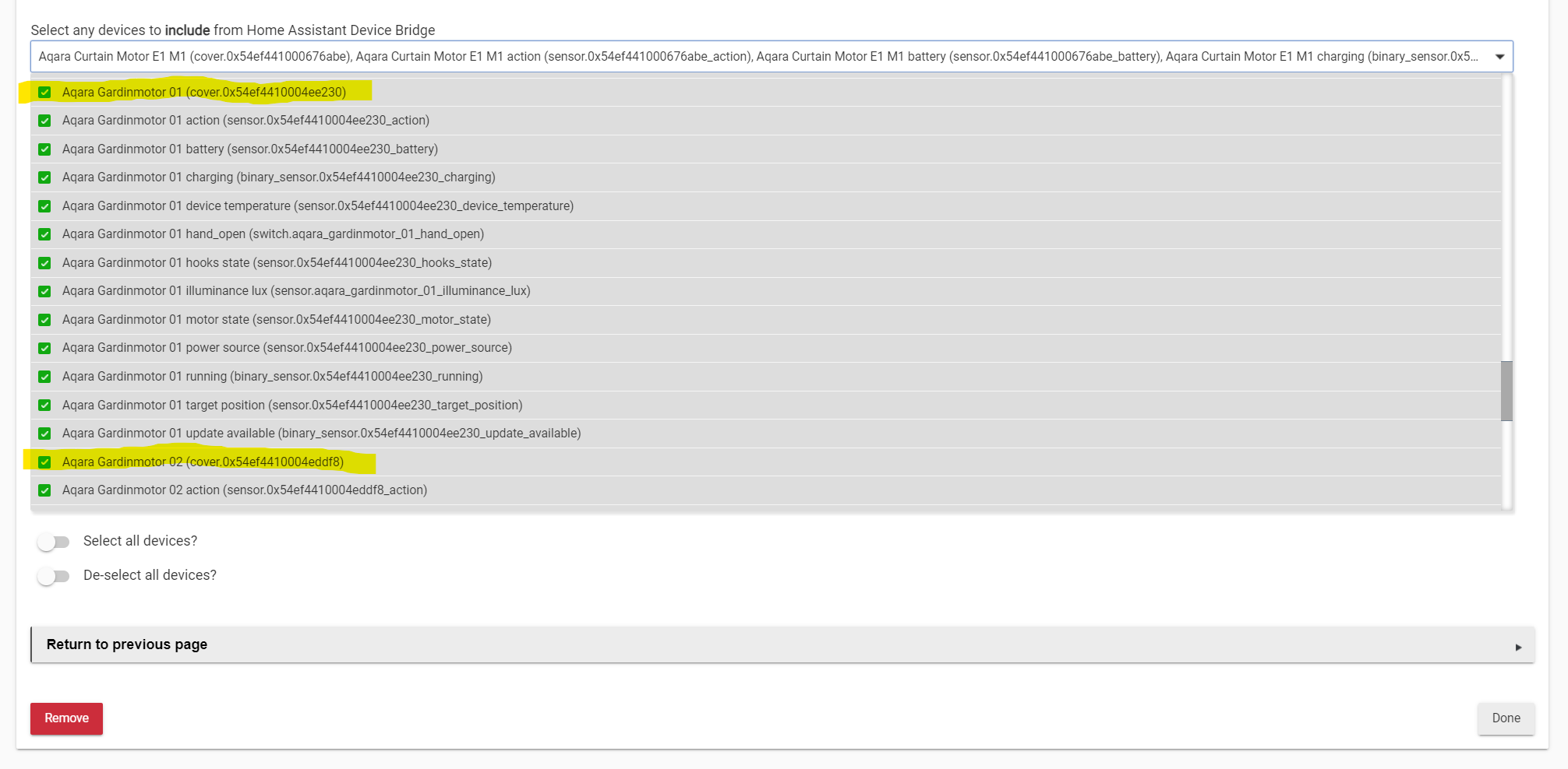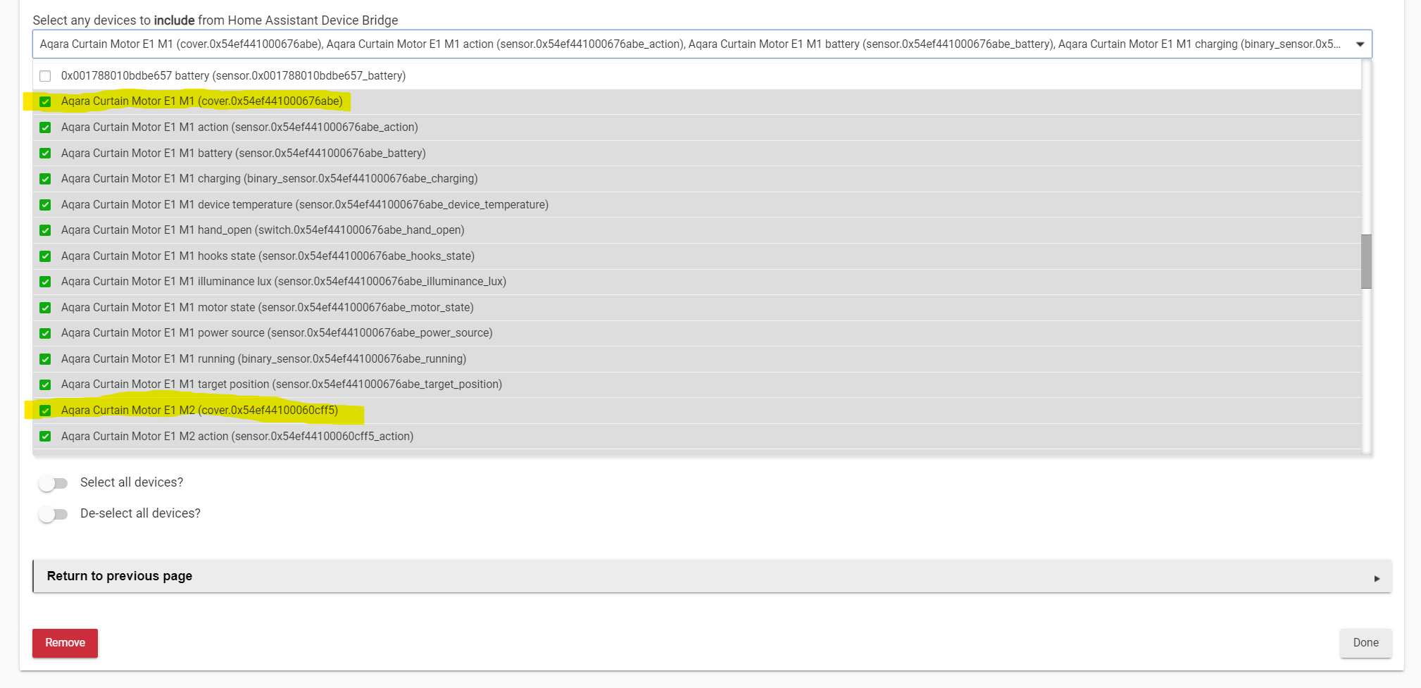 The new curtain drives main objects (Aqara Curtain Motor E1 M1 /-M2) appear in the filter list of the Home Assistant Device Bridge: