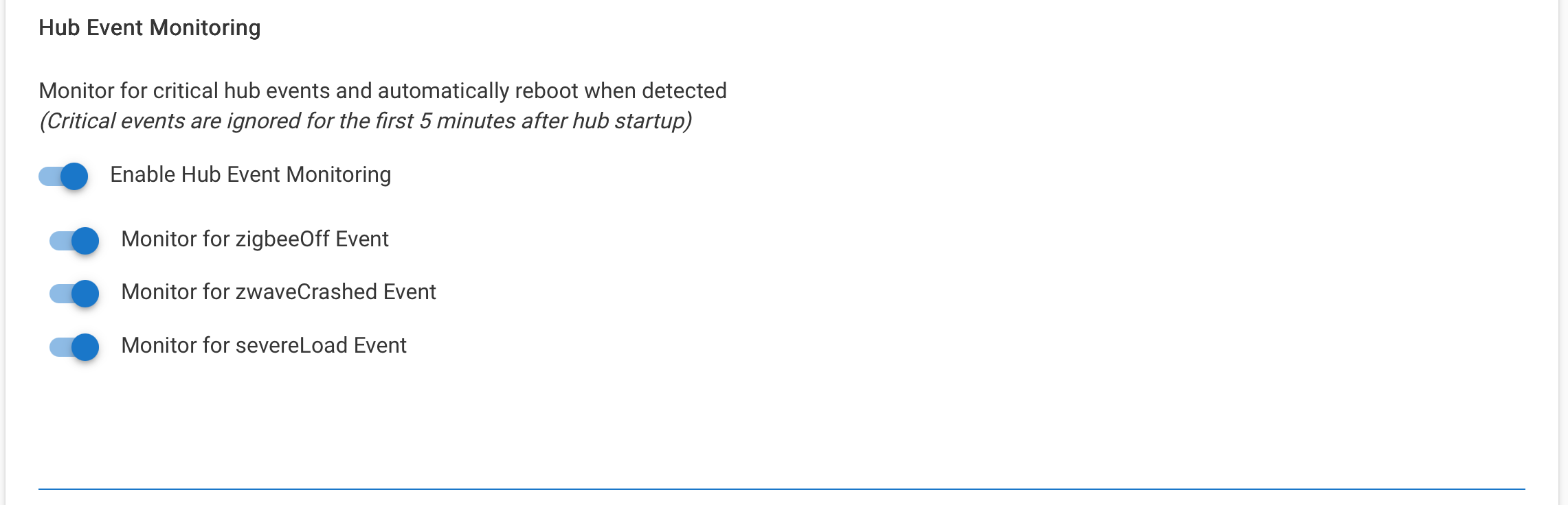 2026-01-12 v1.2.0 - Renamed to "Hub Health Monitor & Auto Reboot" and added hub event monitoring for zigbeeOff, zwaveCrashed, and severeLoad events with 5-minute startup grace period