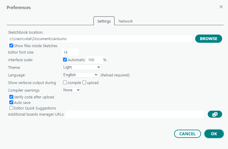 In Arduino IDE: File-> Preferences is pointed to the above location: