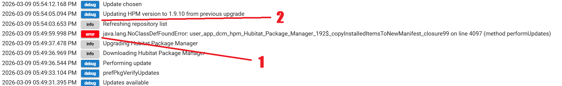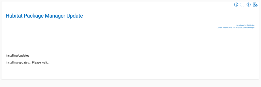 Updated from 1.9.9 to 1.9.10. During the update, the version number changed in the upper right, but the screen continued staying on the updating message. Of course, giving it some time and then going back to Apps and opening HPM worked fine.