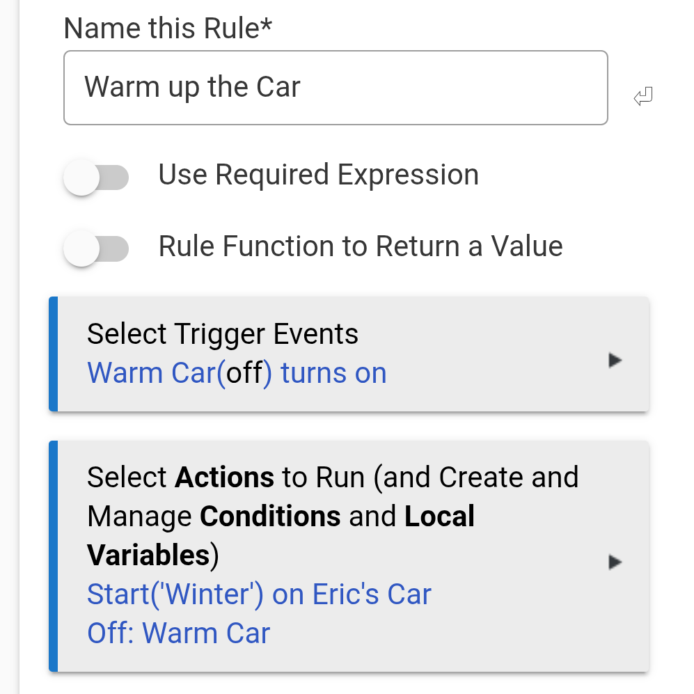 - (Optional) In Google Home, create a custom action to turn on the switch when a phrase is uttered (such as "Warm up the car.").