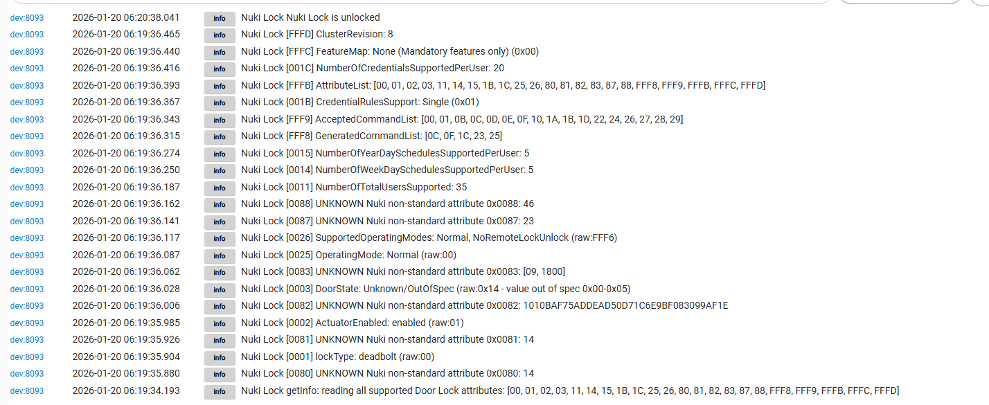 Bridge#289 Device#04 (Level Home Level Bolt (Matter)) getInfo: reading all supported Door Lock attributes: [00, 01, 02, 21, 23, 25, 26, FFF8, FFF9, FFFB, FFFC, FFFD, FFFC, FFFD]