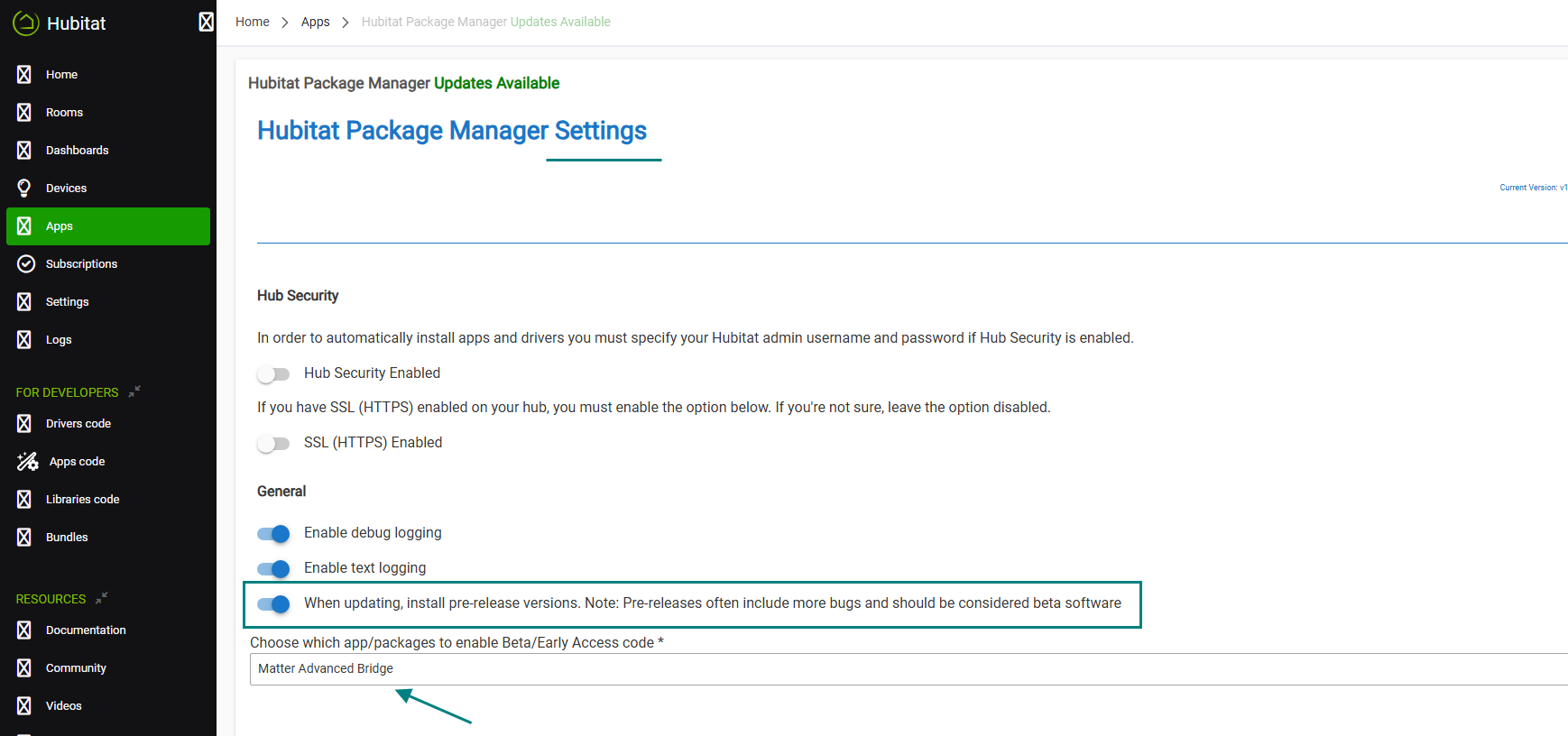 Then, in the HPM settings, enable the “Install pre-release versions…” option and add the “Matter Advanced Bridge” suite to the list of authorized drivers and apps: