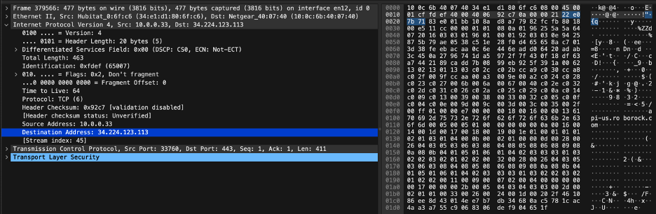 Here is the wireshark of Hubitat resolving INCORRECTLY (stale) to an IPv4 (34.224.123.113) BEFORE the reboot and the driver is sad