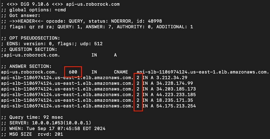 Yea, it is DNS caching the IPv4 and not listening to the TTL. In this case the DNS should be renewed after 600 seconds (10min) for 'api-us.roborock.com' CNAME and only 2 seconds for ELB A record.