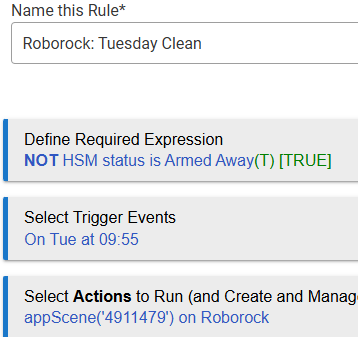 But then I realized this driver had the ability to tell the vac to run a saved routine (aka scene). This post describing the feature and this example rule got me on the right track.