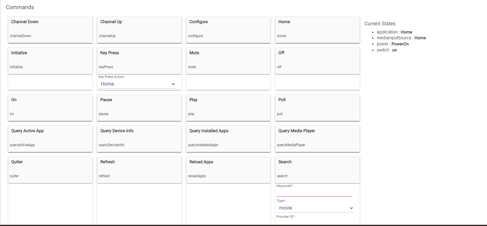 This might explain why none of the power related controls work on the device page - specifically, the On and Off buttons as well as the Power, PowerOn and PowerOff commands under the Key Press menu. Pause does work, however. After turning off the TV from the Roku Stick, eventually the "switch" and "power" status fields turn to off in the event log. At that point, the rule kicks in, but it is a long time after the power button is pressed on the Roku Stick.
