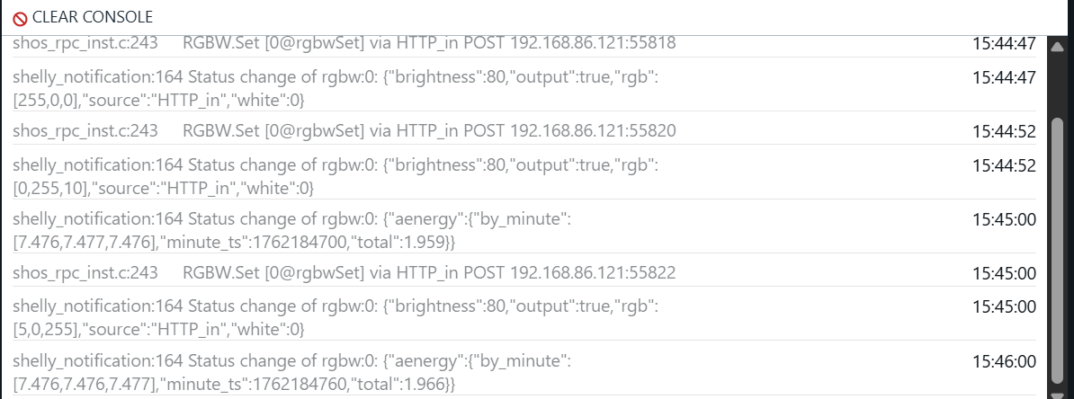 I have the device RGB control working as expected but I was hoping to be able to use the hubitat button to trigger the script however when I push the button in the hubitat nothing happens on the shelly device. (see logs belows)