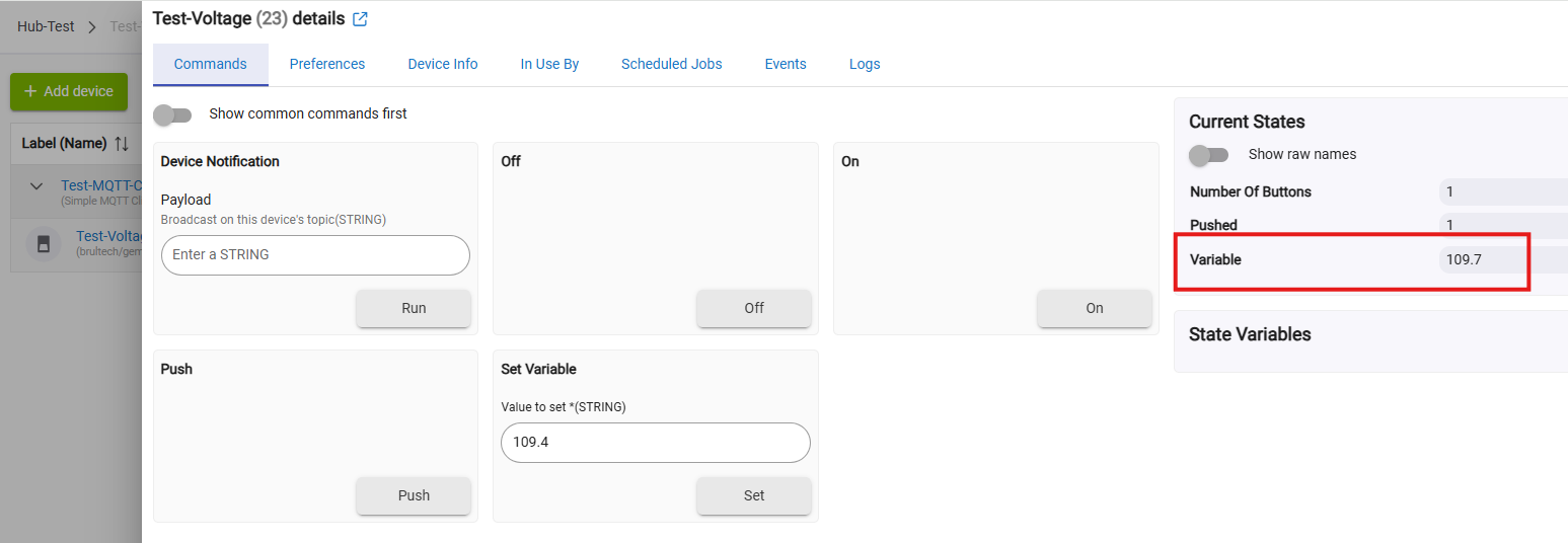 If the switch is already on, Hubitat doesn't treat turning it on again as a new event, which means you can repeatedly publish the state of your device without firing a rule over and over. - Variable: Any other message will be stored in the