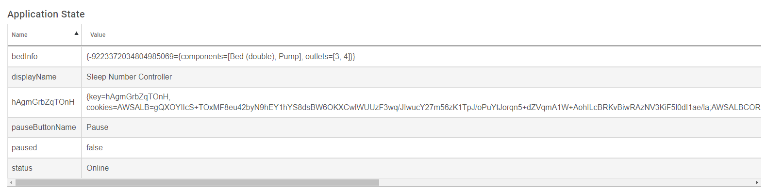 [app:101](http://192.168.2.170/logs#app101)2020-12-07 09:58:45.505 pm [debug](http://192.168.2.170/installedapp/configure/101)Response data from SleepNumber: [beds:[[status:1, bedId:-9223372034804985069, leftSide:[isInBed:false, alertDetailedMessage:No Alert, sleepNumber:60, alertId:0, lastLink:00:00:00, pressure:827], rightSide:[isInBed:false, alertDetailedMessage:No Alert, sleepNumber:90, alertId:0, lastLink:00:00:00, pressure:2173]]]]