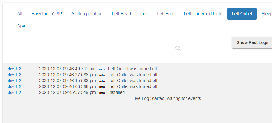 [app:101](http://192.168.2.170/logs#app101)2020-12-07 09:58:47.405 pm [debug](http://192.168.2.170/installedapp/configure/101)Sending request for /rest/bed/-9223372034804985069/foundation/outlet with query [_k:E76vaZA7CEGTk, outletId:4]