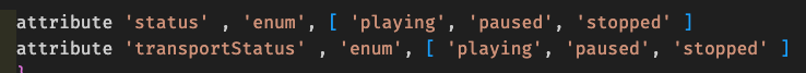So they don't need explicitly defined... but status is defined as 'STRING' on the capability. Someone else reported it not quite working the same way the system Sonos app did when using it with WebCoRE, likely because it's a string and not an enum. So I added it as an explicitly defined enum, which hopefully fixed it in WebCoRE (haven't heard if that's fixed or not yet).