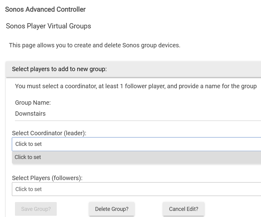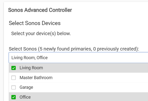I rebooted my Sonos devices as suggested above and Sonos Advanced Controller was then able to discover them. Now I'm trying to create a group using the Living Room and Office Sonos devices (See Fig. 1). Now under Hubitat's "Devices" I have "Sonos Advanced - Living Room" device (See Fig. 2). But when I attempt to create a group under "Sonos Player Virtual Groups", all of the options are empty (See Fig. 3).