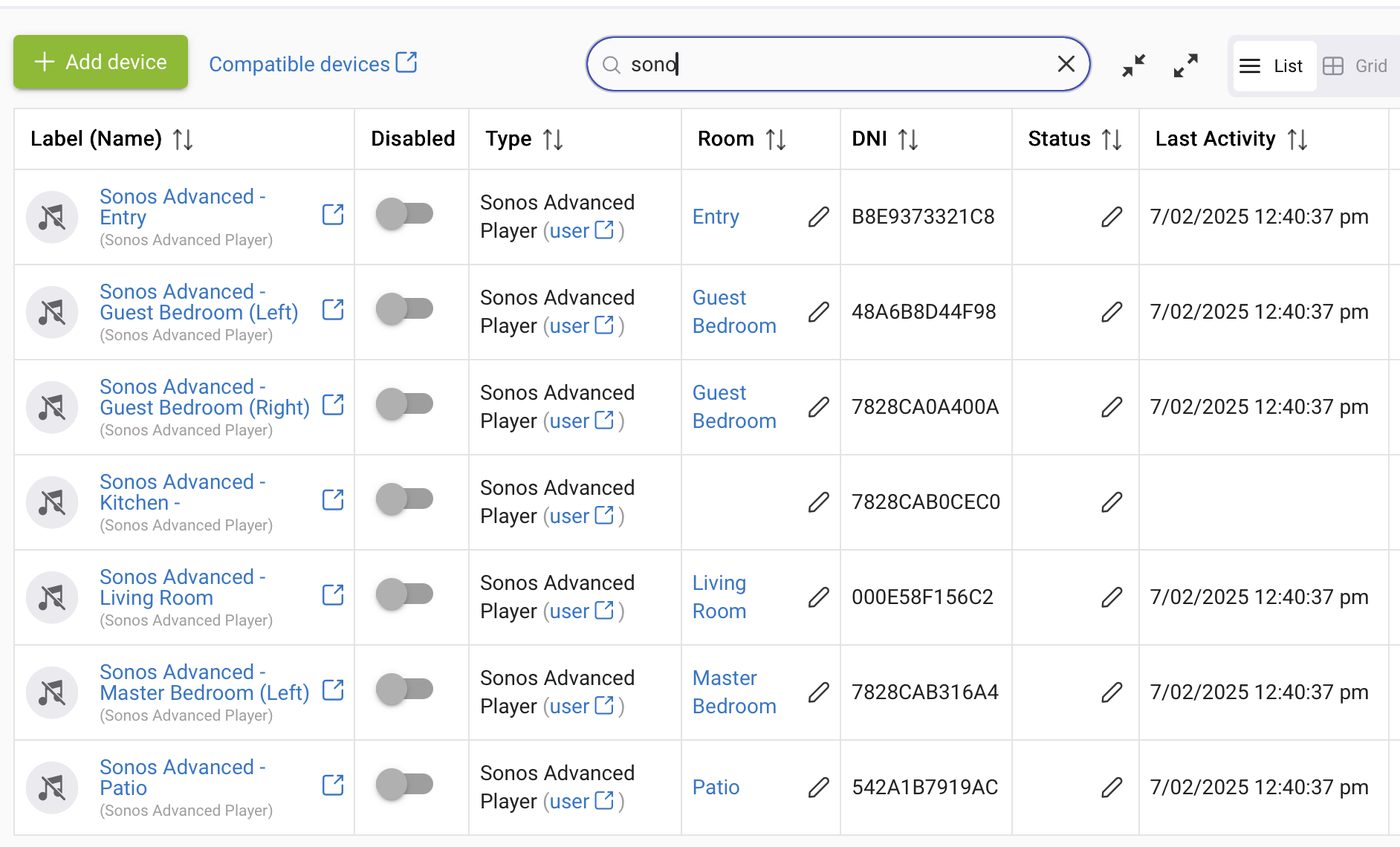 Hello All, finally cut over to Sonos Advanced Integration. Nice app! Took me a few tries to get all my speakers pairs found, but now have all 3 pairs as devices. Family Room, Living Room, and Lanai. Have initialized them all. Problem is that when I try to add all 3 pairs to a group, only FR & Lanai show up. LR does not. And when I got to the LR Device page it looks - different. See attached screen shots of the Command pages and Device Info pages (note FR and Lanai look the same).