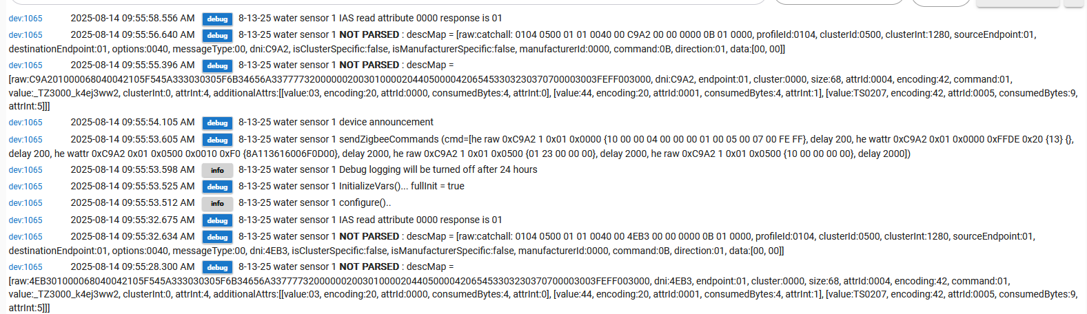 I think the key to my problems is that there is messages not being parsed as shown in the earlier picture..... @kkossev are those errors causing the problems of it not seeing wet and dry reliably?