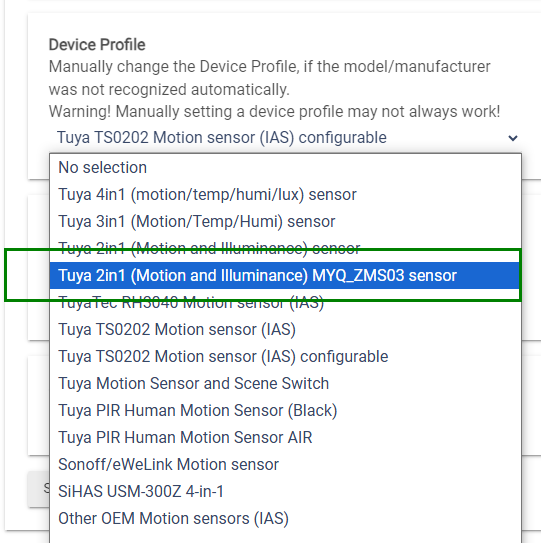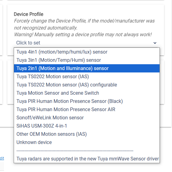 First, select a device profile that may be closest to the new device. In this case it could be the "Tuya 2in1 (Motion and Illuminance) sensor" :